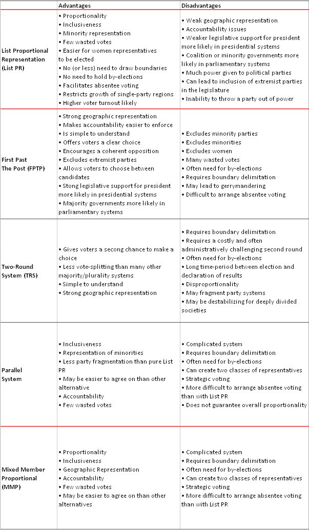 Table 7: Five Electoral System Options: Advantages and Disadvantages