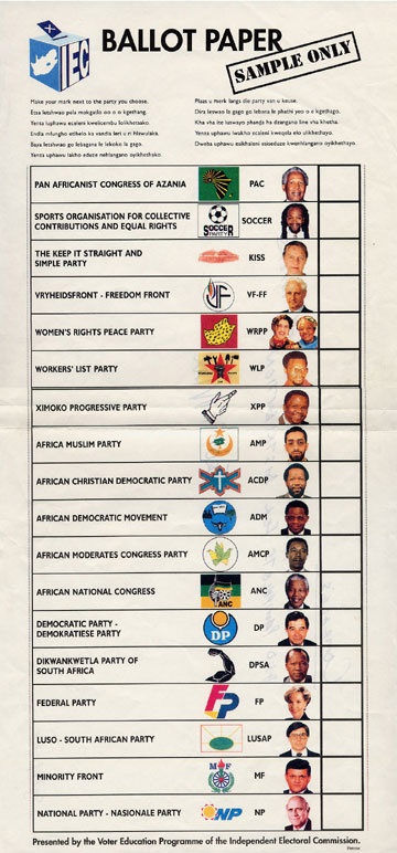 The practice of having one ballot for the National Assembly and one for the provincial parliament also proved to be an important innovation in the electoral system design. Until a few months before the election, the ANC was still insisting on a single ballot which would be counted for both the national and provincial elections. This was quite clearly a manoeuvre to advantage the larger, nationally-based parties and was only changed through the pressure of an alliance of business leaders, the Democratic Party, and international advisers. The eventual results did show that large numbers of voters had split their national and provincial ballots between two parties, and it appears as though the major beneficiaries of separating the ballots were the small Democratic Party and the Freedom Front. Both polled more than 200,000 votes in the provincial elections over and above their national result, which went a long way to explain the 490,000 drop between the NP’s national and provincial totals.