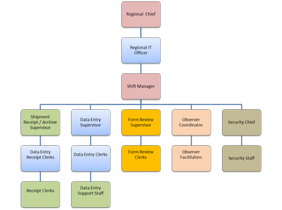 Le centre de dépouillement national, les centres de dépouillement régionaux et les centres de dépouillement des circonscriptions ont reçu des copies des formulaires d’inventaire des bulletins de vote et de résultats émis par les bureaux de vote relevant de leurs domaines de responsabilité respectifs. Les responsabilités et les activités de chaque niveau (national, régional, circonscription) dépendaient des ressources logistiques et de l’infrastructure TIC que la CEN était en mesure de mettre en place sur ces sites ainsi que de l’expérience du personnel participant au processus.