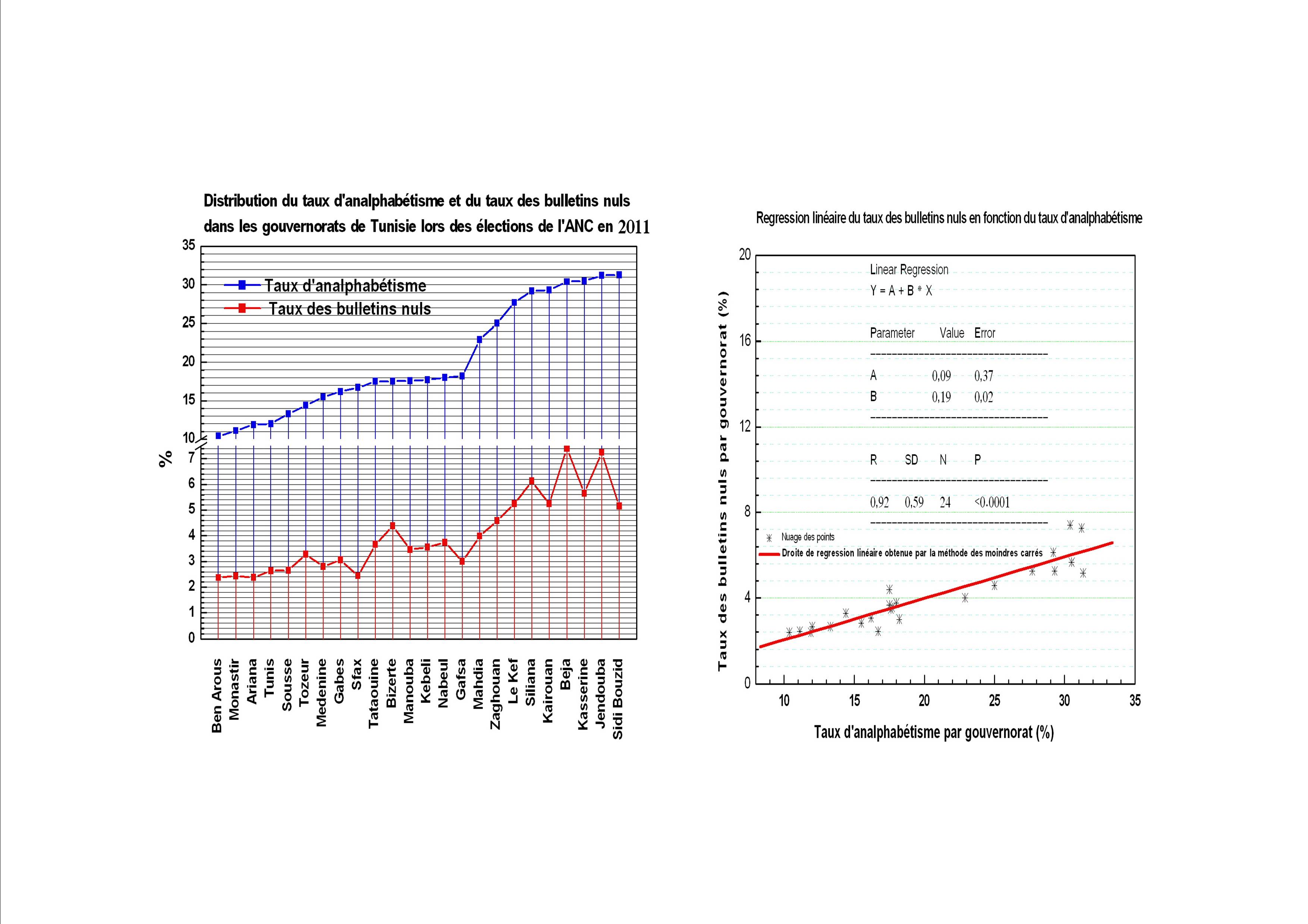 Il est vrai que lors des élections de l’ANC de 2011 en Tunisie, il y a eu un grand nombre de bulletins de vote annulés. Ceci est dû en partie aux difficultés que trouvaient les électeurs analphabètes pour voter. Des études ont montré l’existence d’une corrélation linéaire forte ente le taux d’analphabétisme dans chaque circonscription et le taux des bulletins qui y sont nuls. Selon l'Institut National des Statistiques de Tunisie ( INS), le taux d'analphabétisme des tunisiens âgés de 10 ans et plus est de 19% en 2010. -