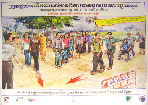 Developed by Action on Disability and Development/Cambodia, these posters were used in July 2003 elections to educate all voters that voters with disabilities have the right to choose their own assistant, and the right to go to the front of the voting line -image courtesy of www.electionaccess.org.