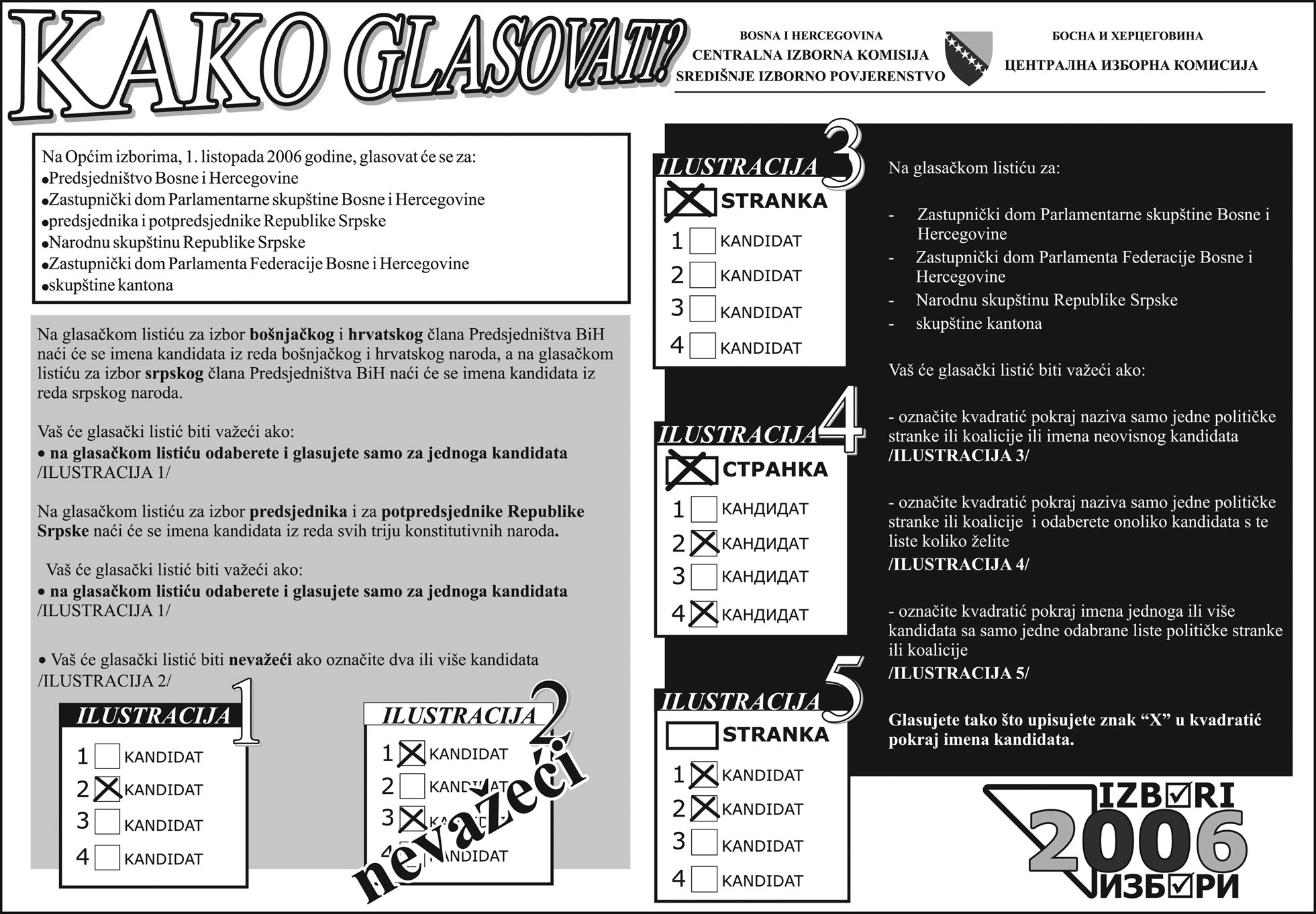 It is an informative poster from the Bosnia-Herzegovina general elections in 2006 showing how to vote.
