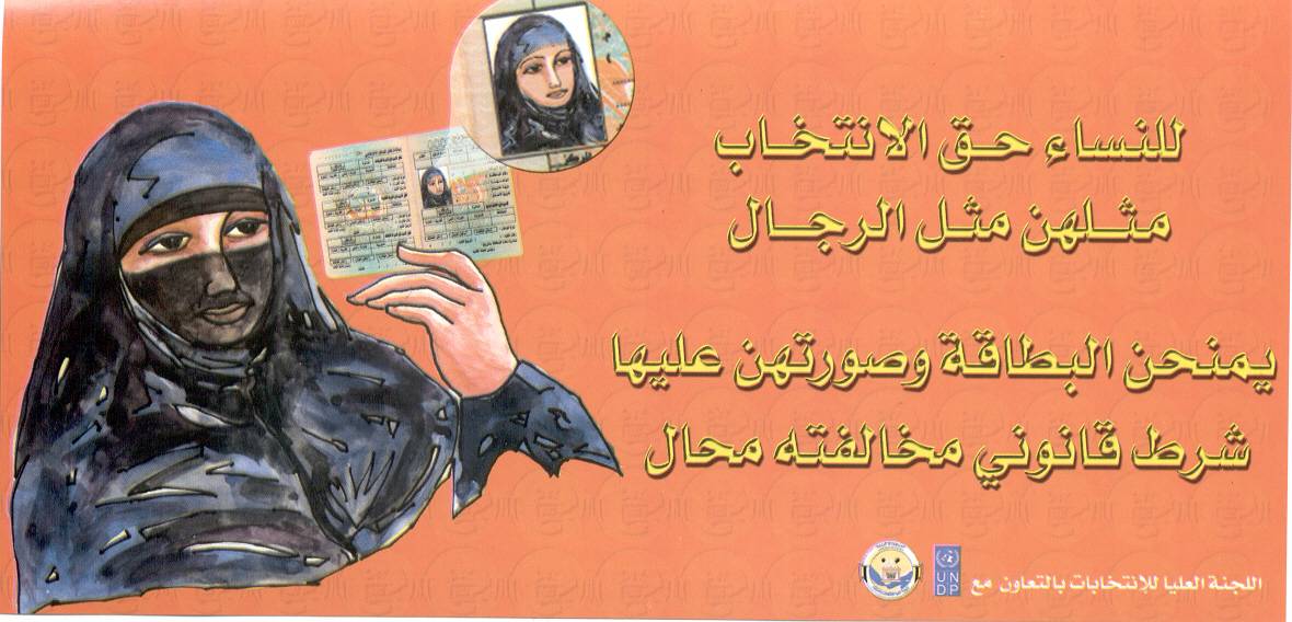 A copy of a voter information sticker developed by the Electoral Support Team of the United Nations Development Programme (UNDP) to promote female participation in the voter registration process for the 2003 Parliamentary elections in Yemen.